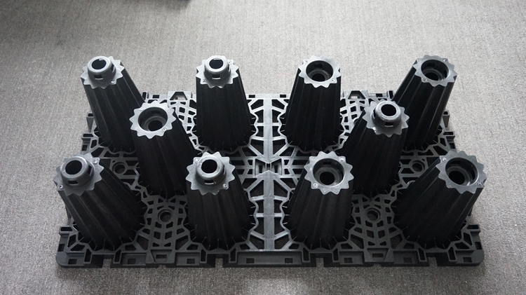 当地面土地紧缺时,可以考虑采用地下渗透池,实际上它是一种地下贮水渗透装置,利用混凝土砌块、穿孔管、碎石空隙、组装式构件等调蓄雨水并逐渐下渗。地下渗透池种类多样,形状各异。上图是用塑料等人造材料组装块外包土工布建造的地下渗透池示例。人造组装式构件(或称渗透箱、渗透块)的最大优点是孔隙率可提高到90%,施工简单。